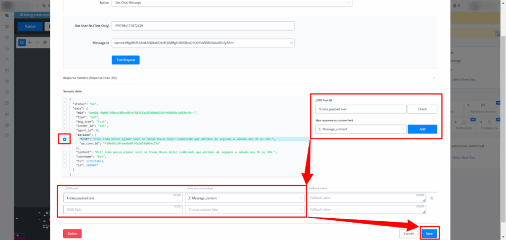 - After testing and successfully mapping the JSON, replace the static Message Id field with a Custom Field that dynamically stores the Message ID.