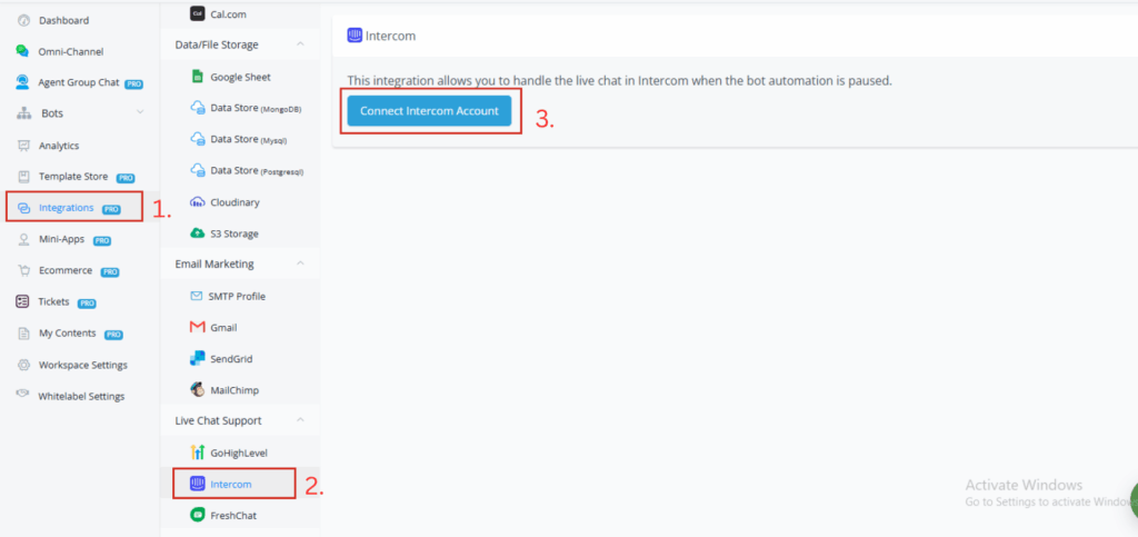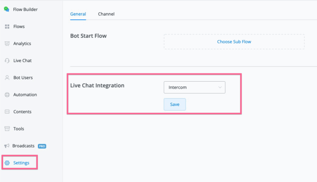 After you linked the channel, you can open the bot, then go to the settings of the omnichannel, and select intercom from the live chat integration.