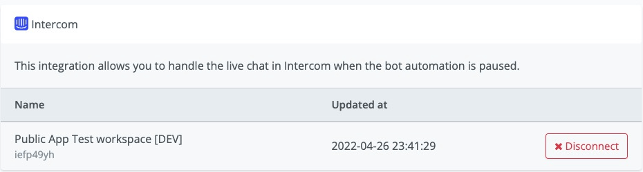 You can disconnect the app, by clicking the button to disconnect Intercom with this workspace.