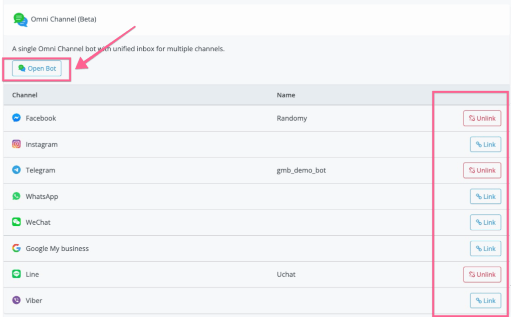 After you integrate with the intercom, you now need to create an omnichannel chatbot inside of ihakimi. You might need to link the channels we currently support(Facebook messenger, Instagram, WhatsApp, Google Business Messenger, WeChat, Line, Viber, Telegram).