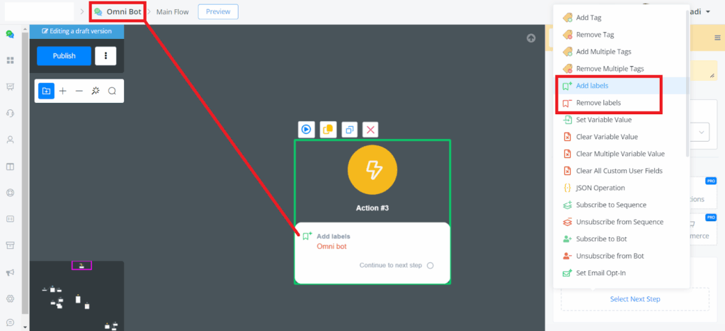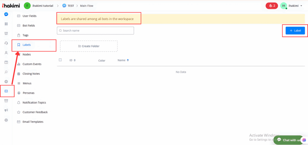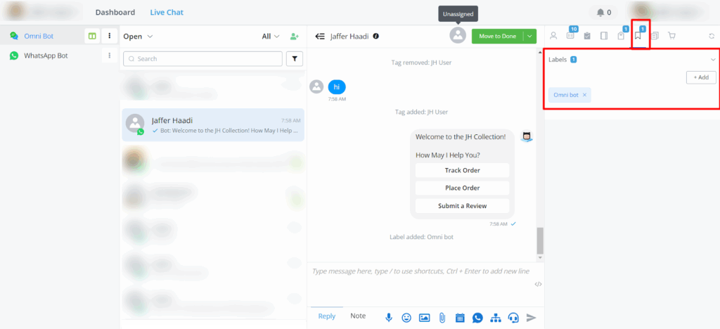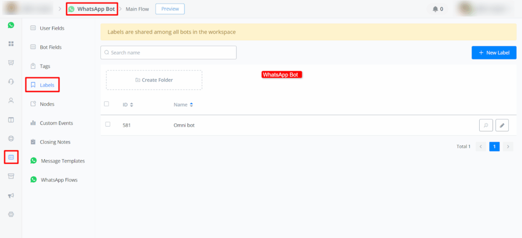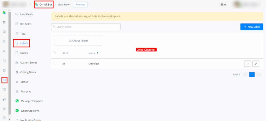 To explain how labels work, we have two bots in the same workspace. One of them is Whatsapp Bot, while the other is Omni Channel.