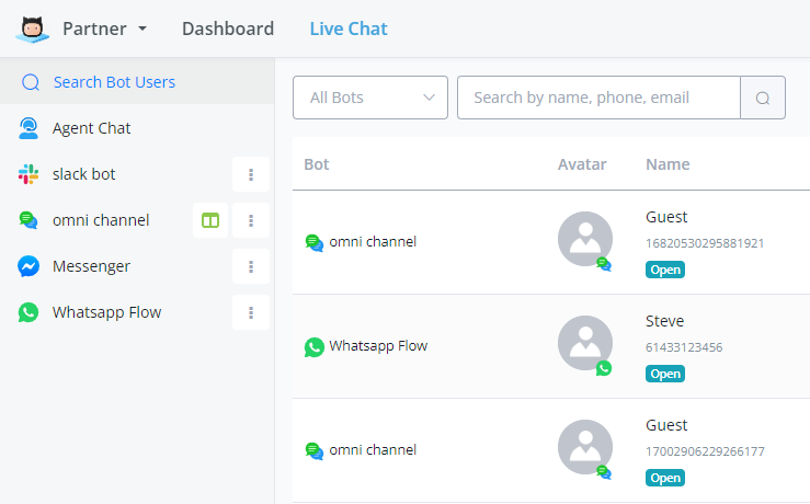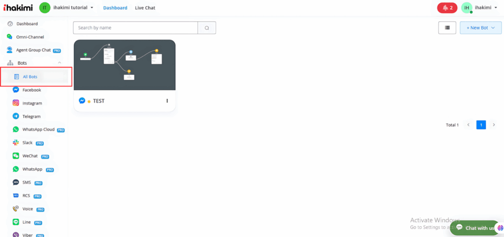 It’s located in the “Live Chat” at the top navigation bar, and you can find the “Search Bot Users” from the left side.