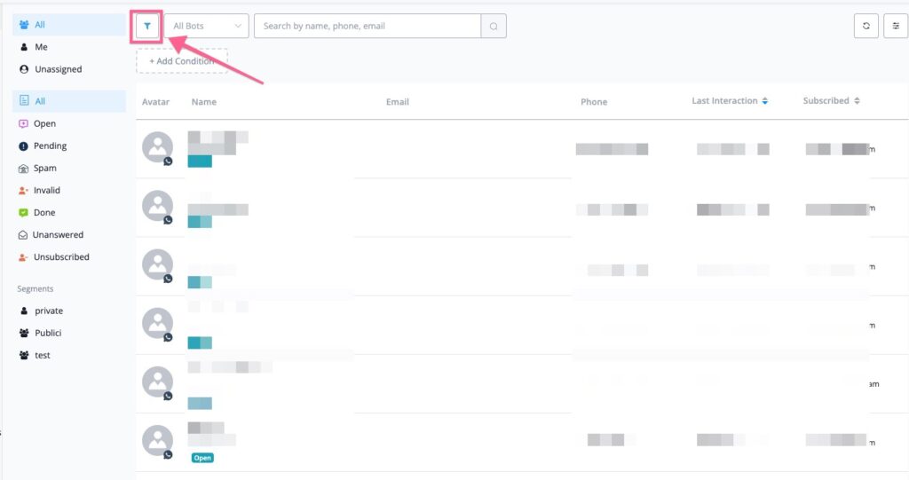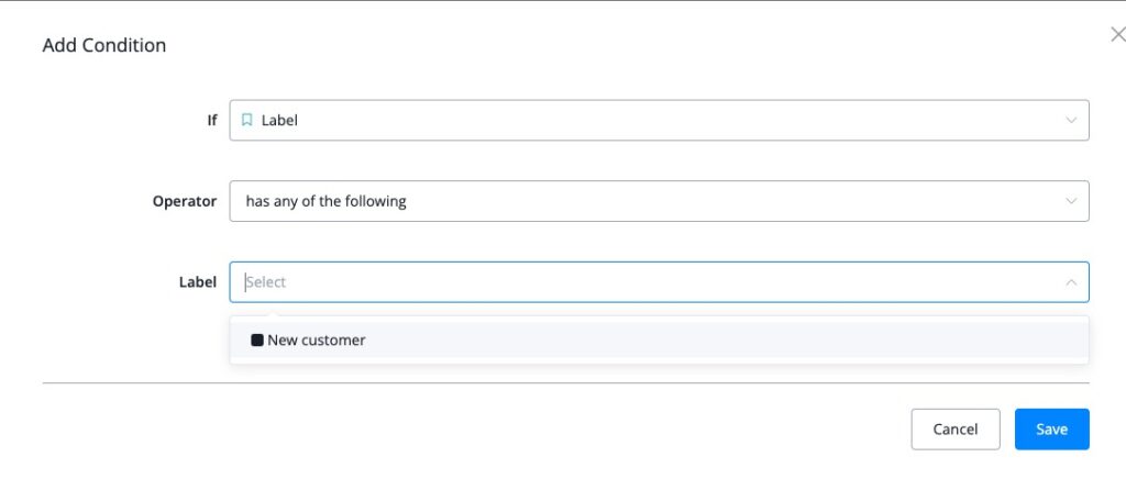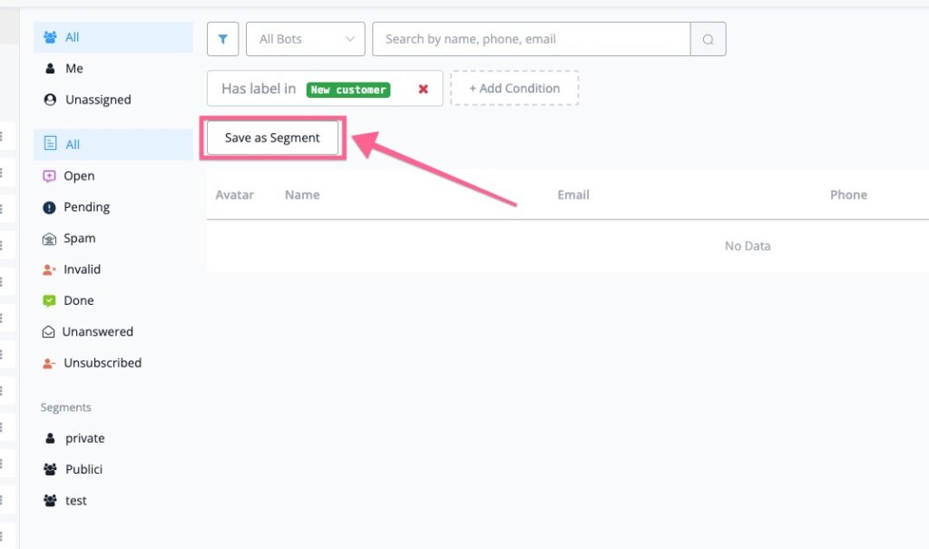 For example, we have created “new customer” label, and it’s shared across all the bots in the same workspace, and you can create the filter like the screenshot below