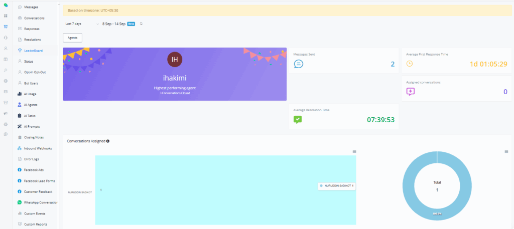 • A donut chart displays the percentage distribution of closed conversations among agents, providing a clear view of who is closing the most conversations.