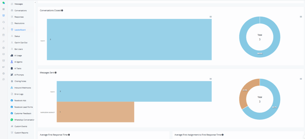 The conversation mode also provides valuable insights into agent response times, focusing on the average first response time and the average assignment to first response time. Below, we detail this information: