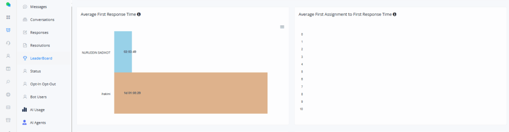 • A bar chart showing the average time each agent takes to provide the first response to a new conversation. This helps monitor how quickly agents address customers for the first time.