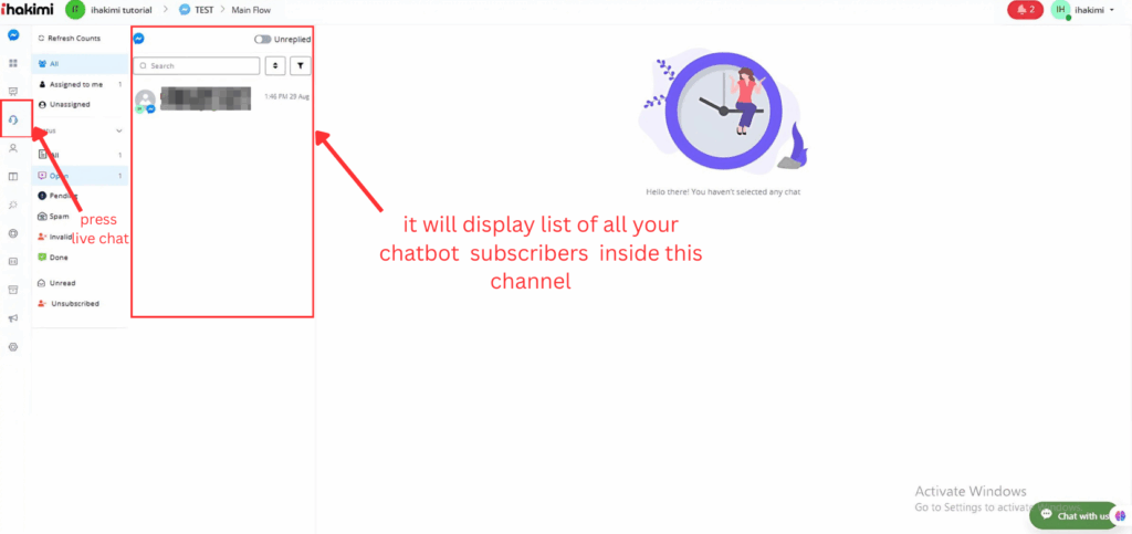 If you are within any of your channels you can also access the live chat from that channel. Just choose Live Chat and the live chat will open up displaying all of your subscribers inside that chatbot channel.