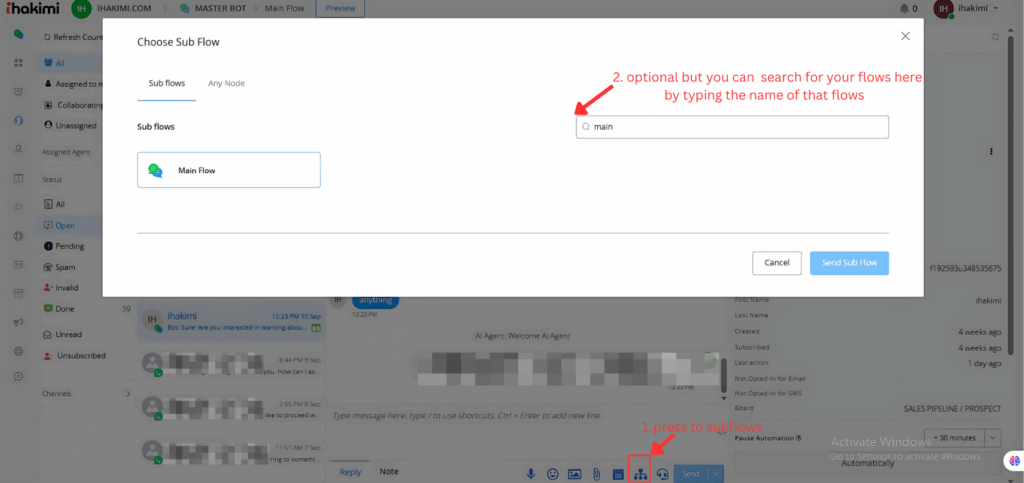 NOTE: Do make sure you have disabled live chat mode before sending the subflow. Otherwise the chatbot will not be able to send the messages inside the flow.