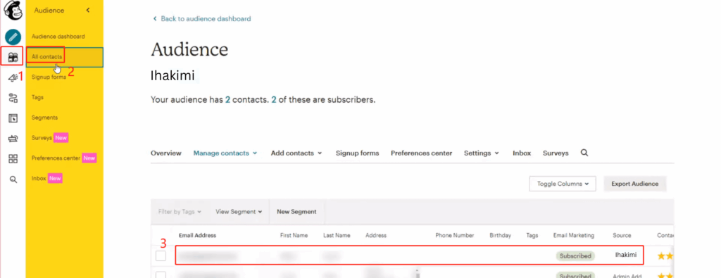 In your MailChimp dashboard, click area 1 and 2 from the left sidebar. Then you will see the audience added from the source ihakimi.
