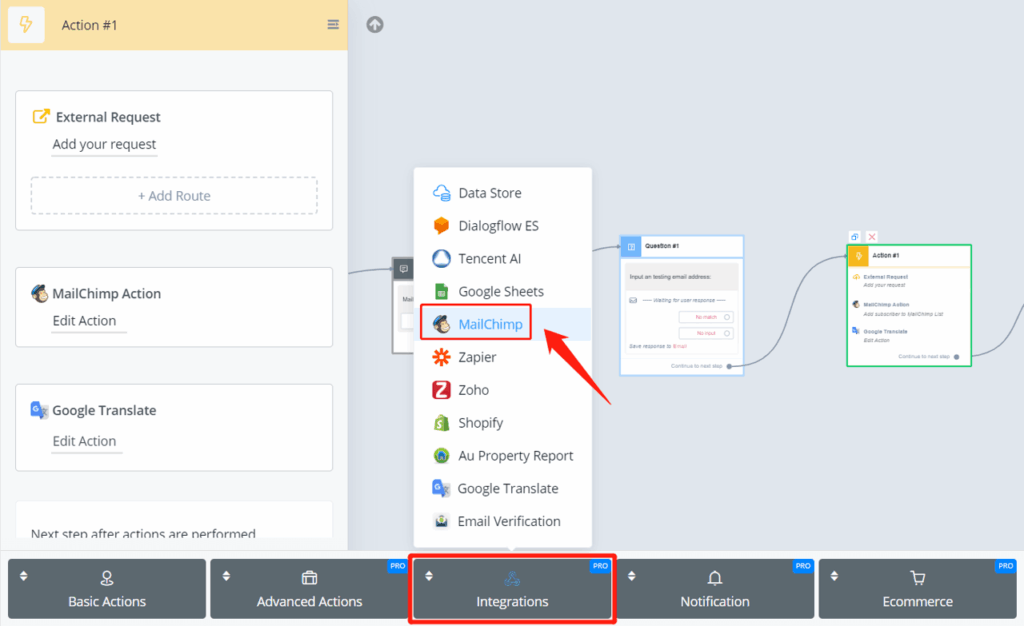 Simply put this Action after a Question step. Pick a MailChimp list and put users’ email address. That’s all about it!