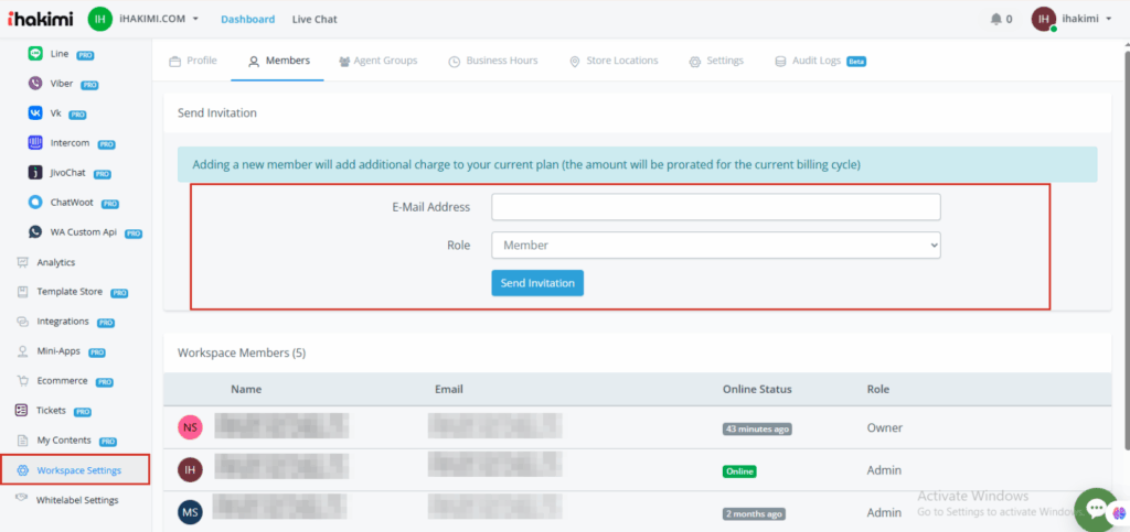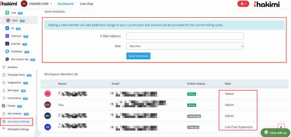 ach “ihakimi account” is to be seen as a person/user. Members are all the people that have limited or full access to the workspace. There are 5 types of roles, Owner, Admin and Member, Live Chat Agent, Live Chat Supervisor.
