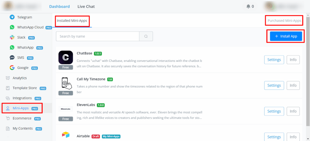 Within the Mini Apps section, you’ll find two main categories: “Install Mini Apps” and “Purchase Mini Apps.” Also a button “+Install App”