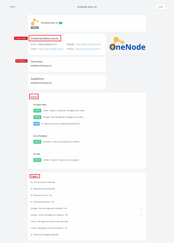 Upon pressing the button, you will be able to view information about the app, including its creator, available actions, triggers, and descriptions.