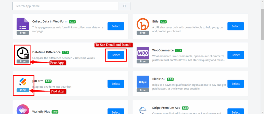 You will see the list of all mini-apps, where you can view their information and install them into your workspace. There are two types of mini-apps available: “Free” and “Paid”.