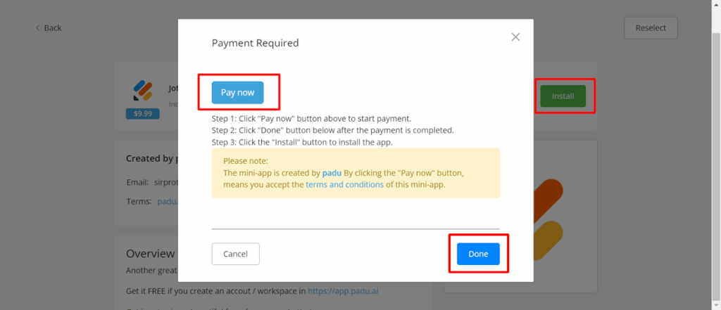 To install a Paid Mini App, you need to make the payment first, and then you can install it into your workspace.