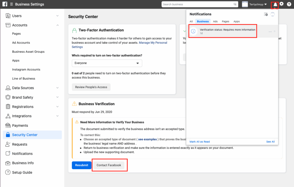 If your request for business verification was rejected by the Facebook team, you should receive an email notification noting that the documents you attached didn’t pass the verification process.