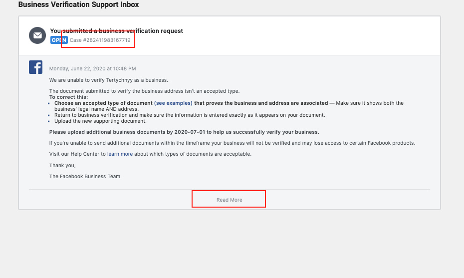 If you click on the ‘Read More’ button, you can start interacting directly with Facebook Support to find out what is missing or which documents are not correct.