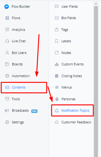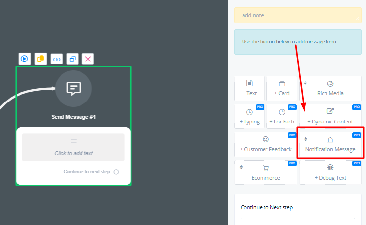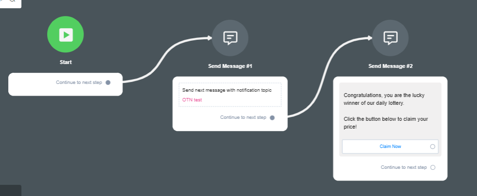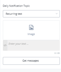 To subscribe the users to a recurring notification, create a Send Message node, then select on Notifications and then select “Daily Notification Topic”
