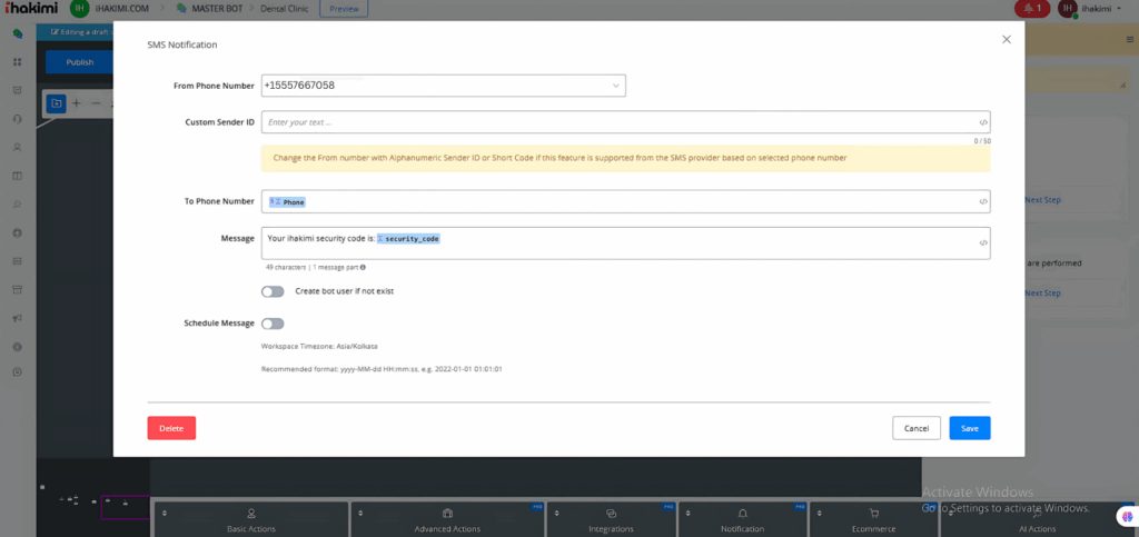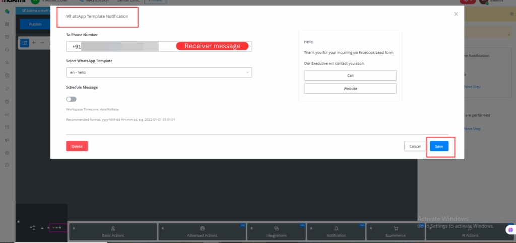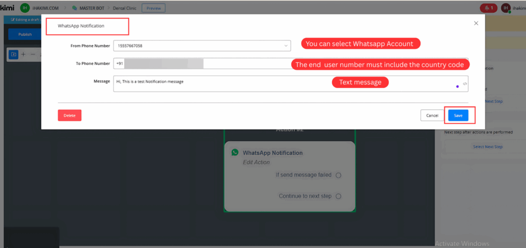 You can select your WhatsApp account to send messages to the user. Make sure the receiver’s number contains the country code.