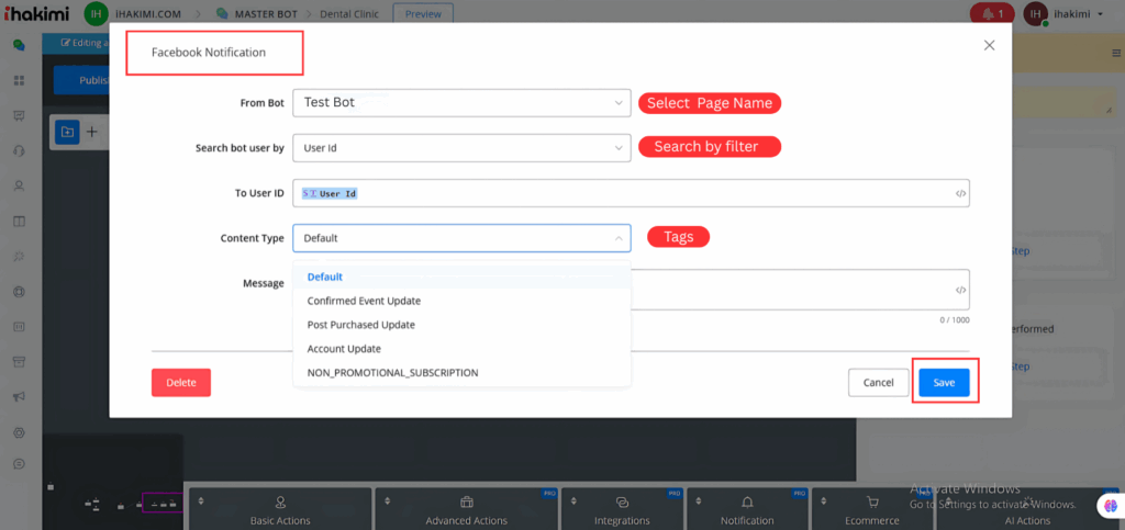 To send a Facebook notification, you will need to set up your Facebook integration first. Same as Telegram or Viber with the added feature of sending messages based on different tags for delivery assurance.