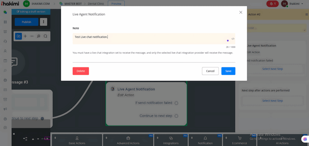 You must have a live chat integration set to receive the message, and only the selected live chat integration provider will receive the message.