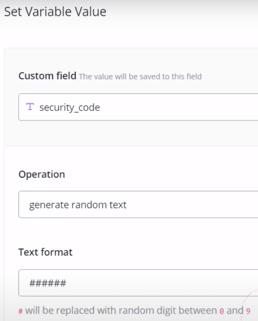 You can use the “generate random text” operation with text variable to get a random security code and send out for verification purpose shown in the pictures.