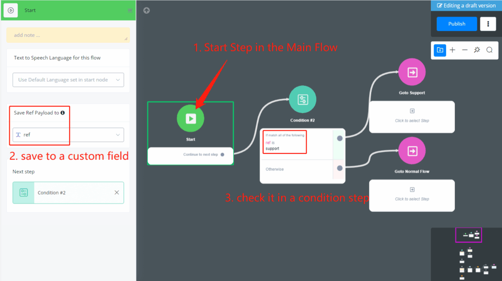 For example, set the payload to “support” here in the notification action and in your voice flow: