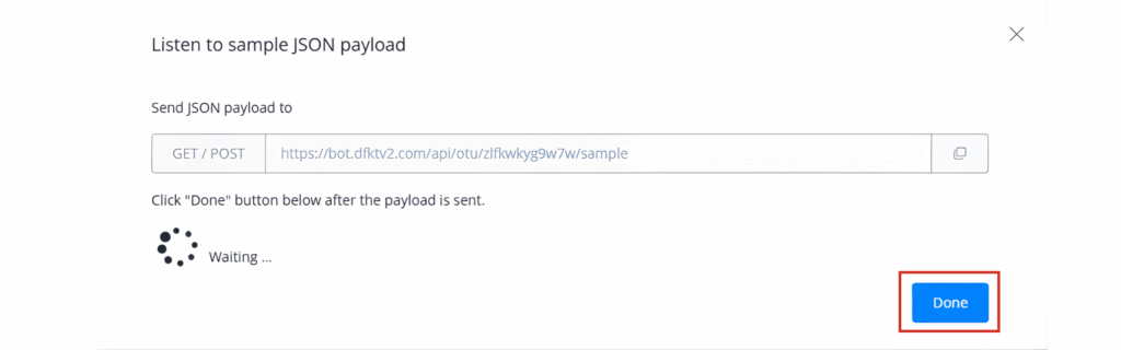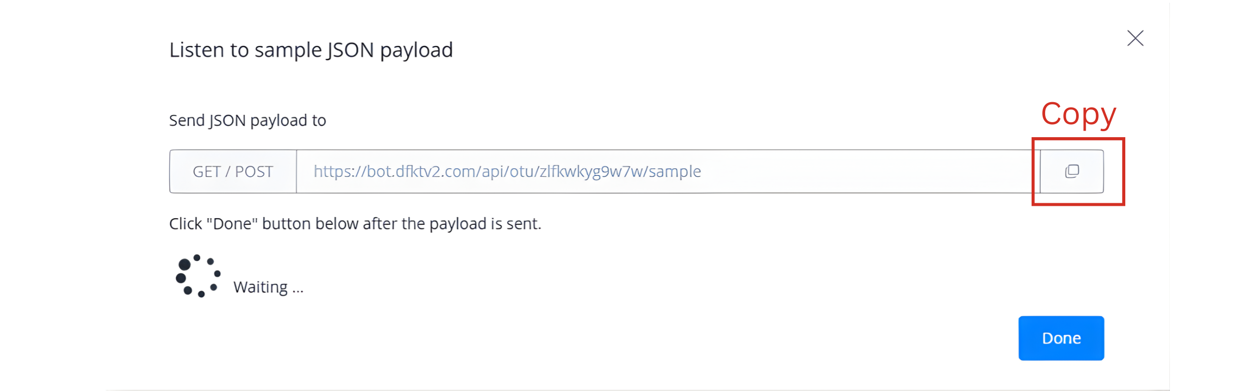 To get real-time data, click on the Listen to data payload button and copy the sample URL for testing. One-time URL supports both the GET and POST method.
