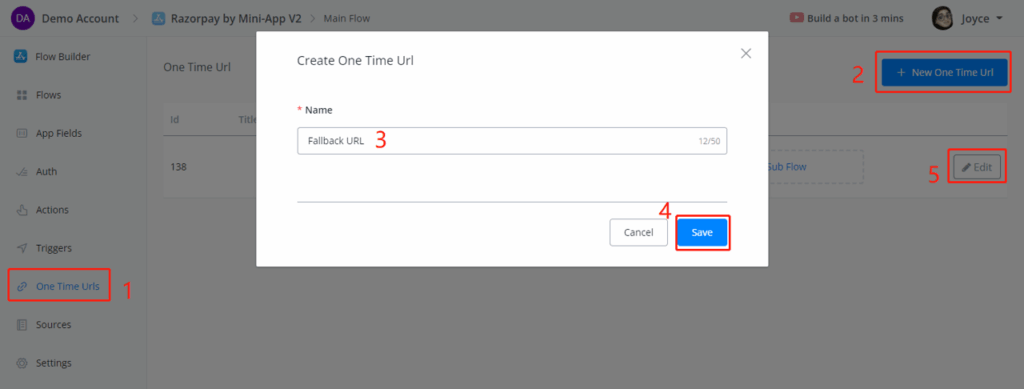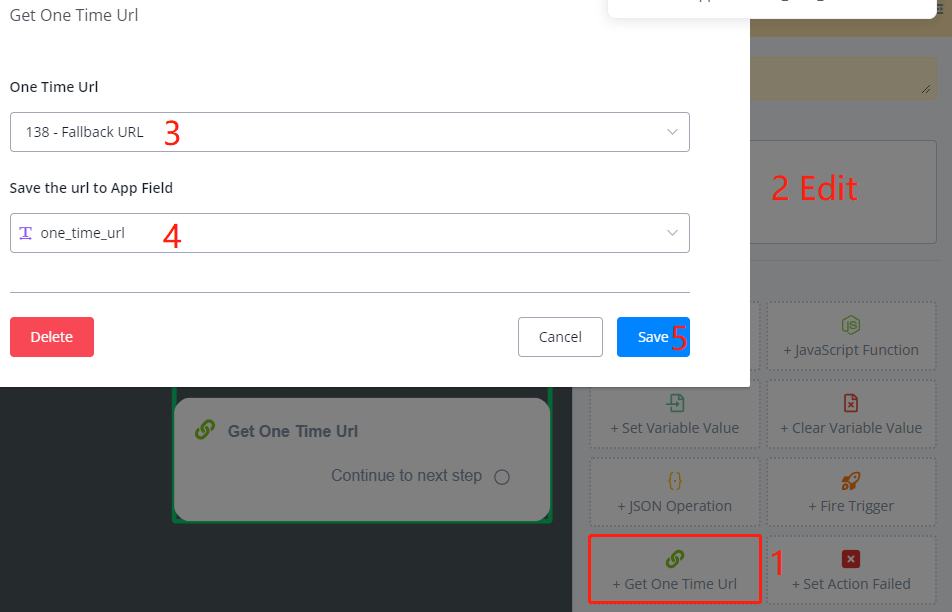 Follow steps 1 to 5 in the above screenshot to edit the One Time Url.