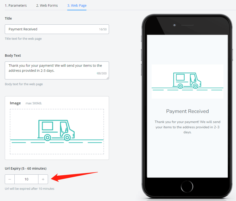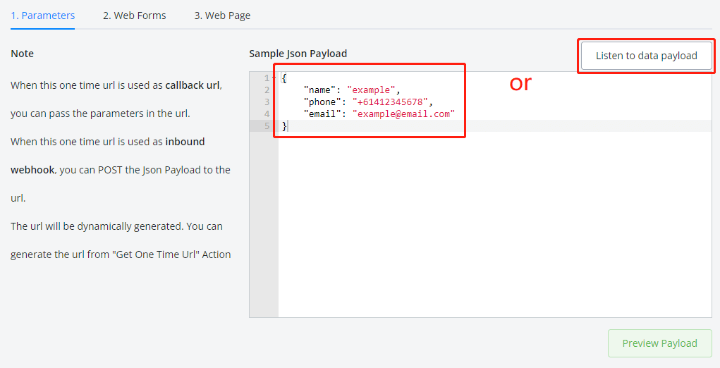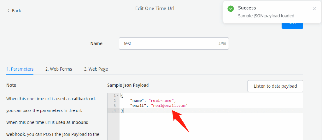 Note – Parameters and Web Forms sections are both optional. You are free to have a one-time URL only receiving data or only collecting data via a form.