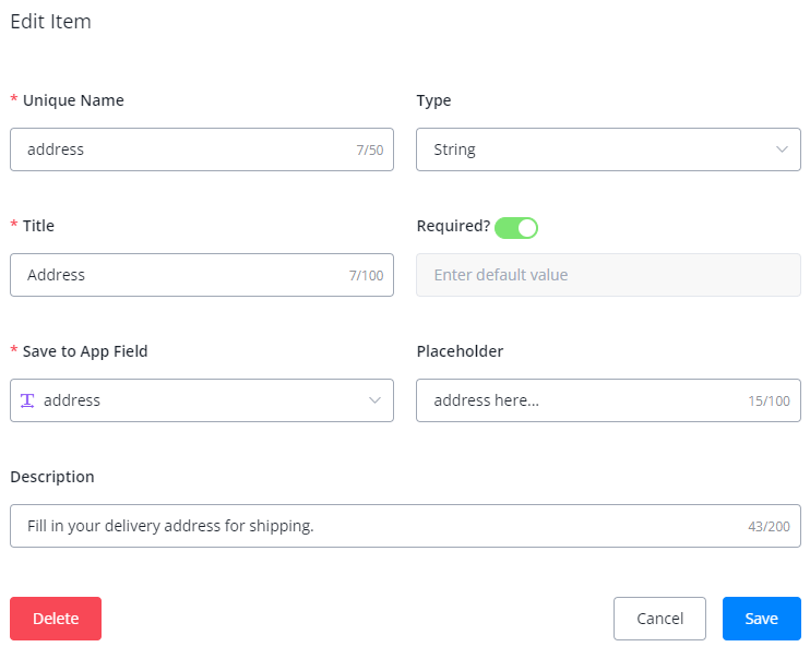 | Save to App Field | Specify where to store the value. Create a new app field right here by typing in a new field name and selecting a field type in the pop-up, or search an existing field |
