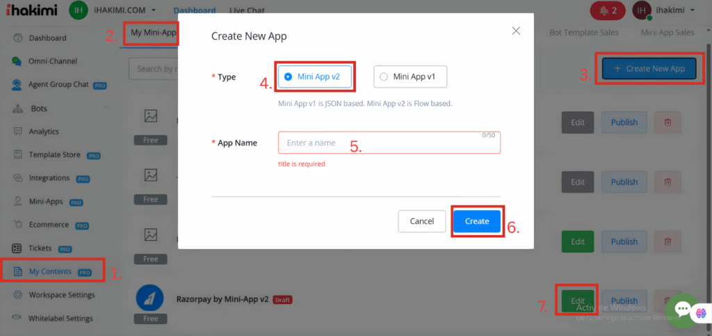 Follow steps 1 to 7 in the above screenshot to create a version 2 app and enter the app builder.