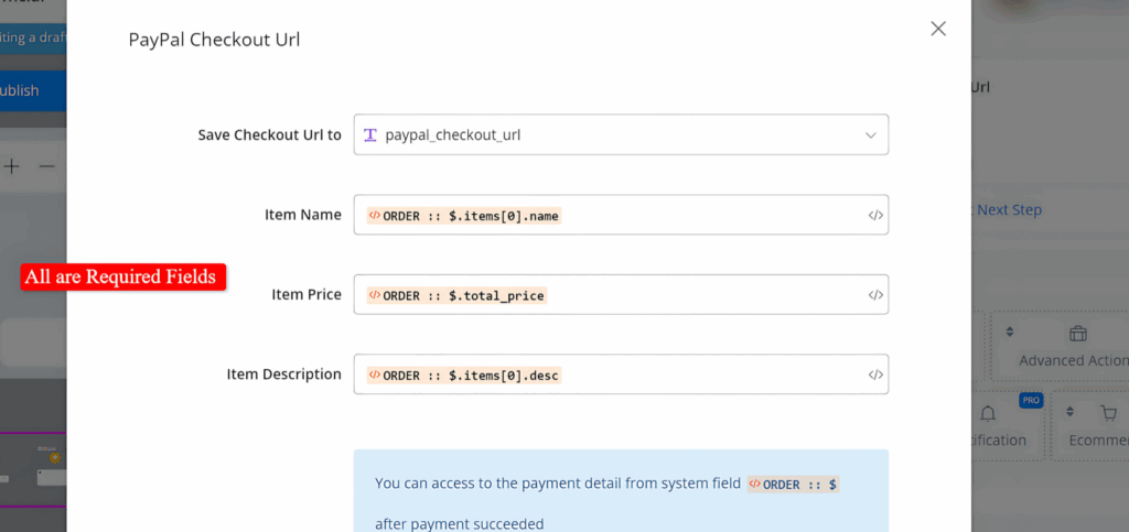 Once you select the PayPal Checkout URL action, you need to provide the following details:
