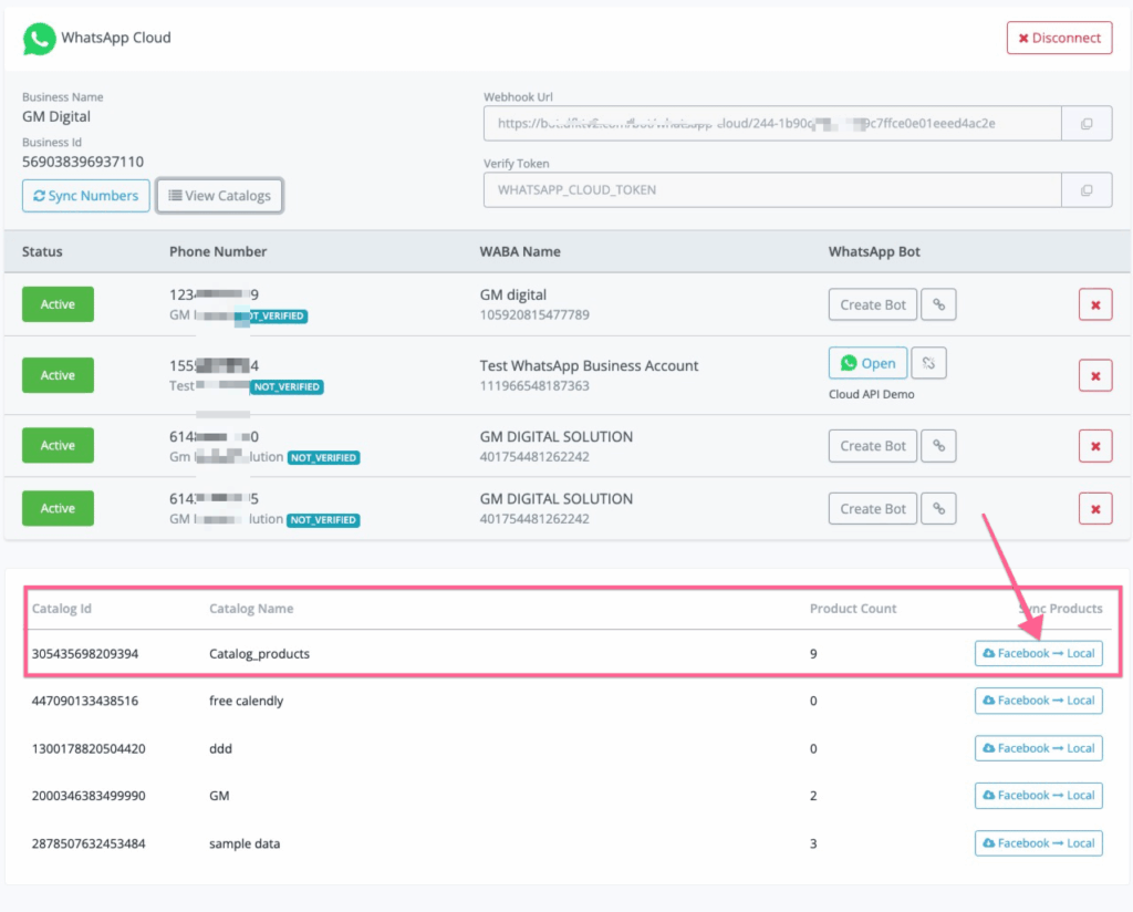 Now back to ihakimi, go to WhatsApp Cloud channel, you can click “View Catalog”, and then it will pull all the catalogs under your current business account.