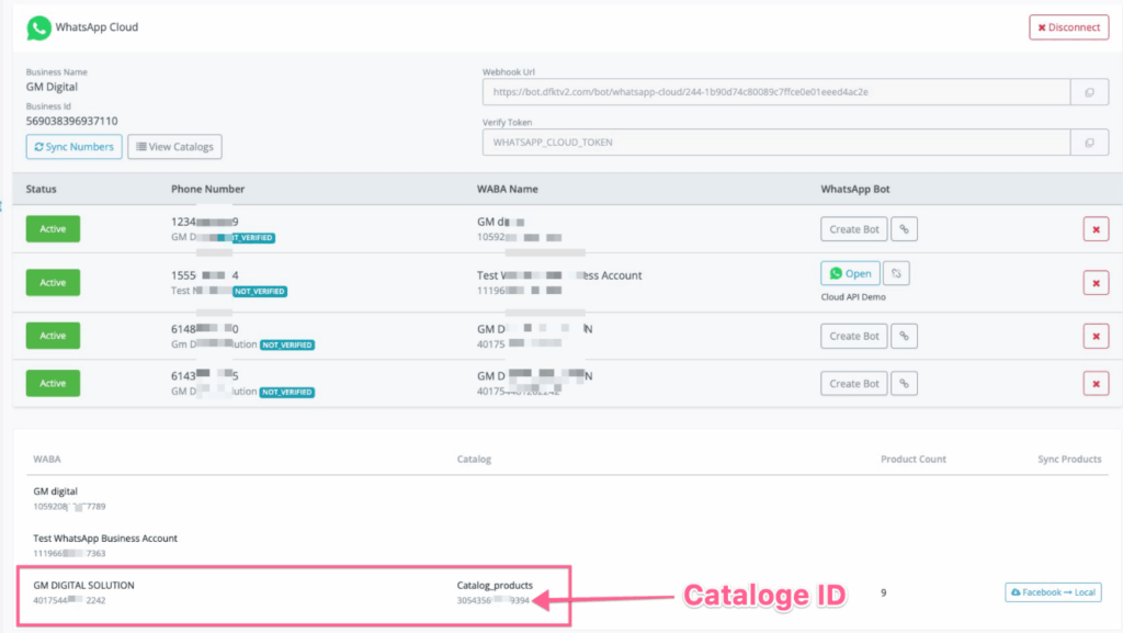If you go to your WhatsApp Cloud API, when you click “View catalogue”, you will be able to see the catalog ID that is connected with your WABA account.