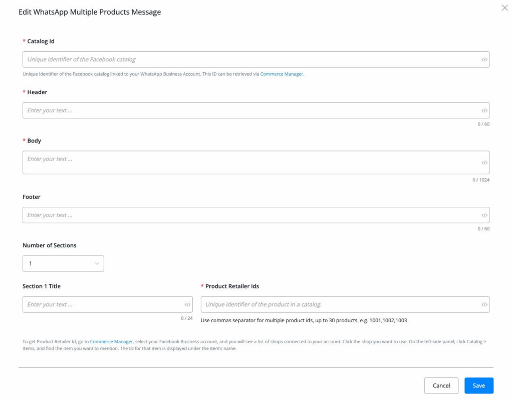 If you are sending multiple product messages, you can select how many sections you want to include, and then choose the retail ids(which are contentID in the Facebook Catalog).