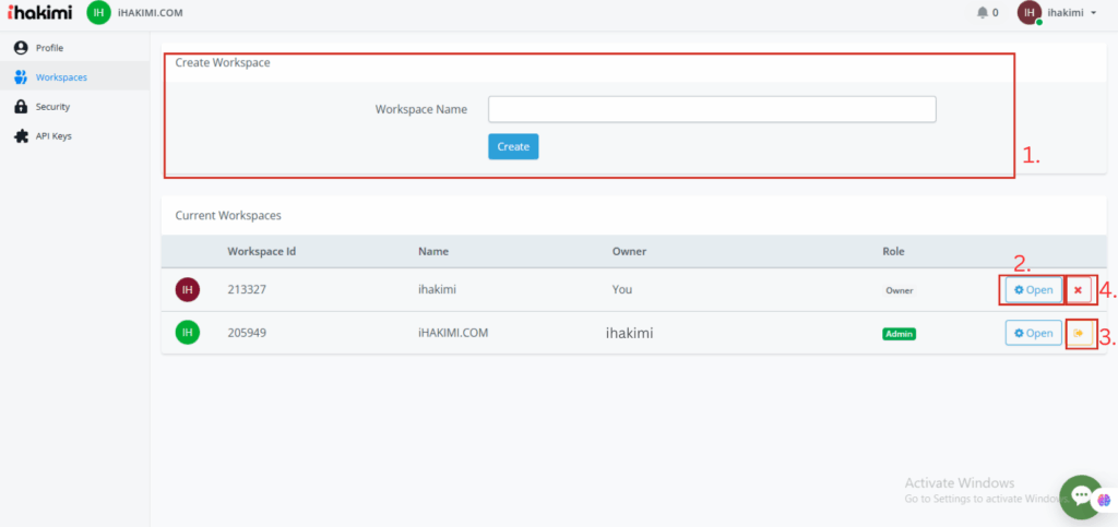 Here you can see all the workspaces you’ve joined. As marked in the screenshot, you can: