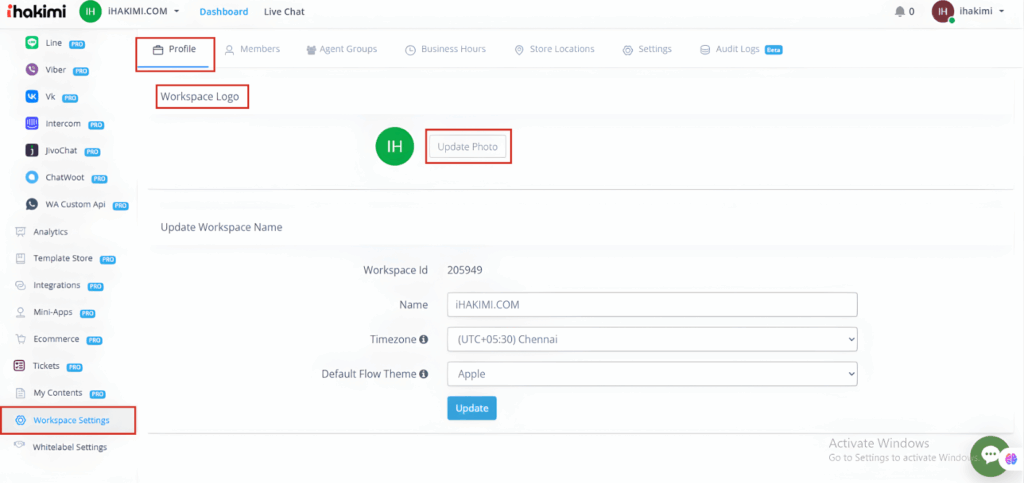 To edit the profile of your workspace, click Workspace Settings and profile in the above screenshot. You can change your logo, workspace name, timezone, and default flow theme.