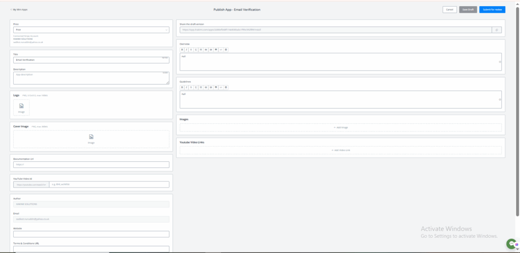 After testing the app, you can record a video or get some screenshots about how to get an API key from you, how to use the app, etc. Click “Publish” when you are ready to submit for review: