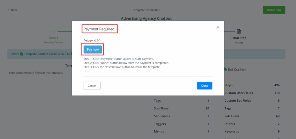 When you click on install template, after selecting the bot where to install the template, you will get the pop-up screen where you will get the button (Pay now) to pay the fee.