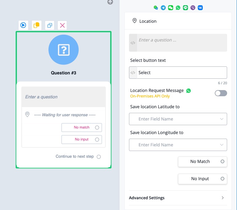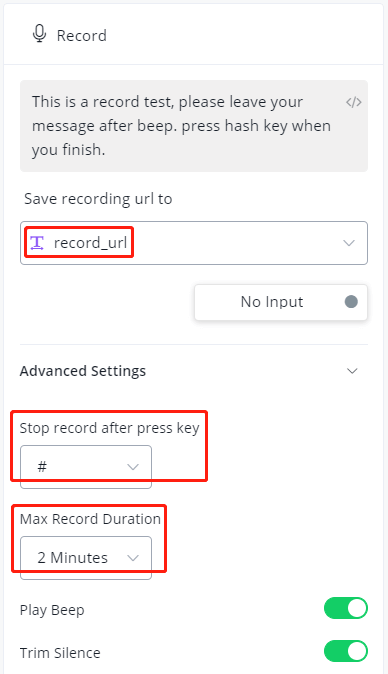 Again, same as asking for picture, audio, video or file, you will need a text variable to save the URL link of the record file. Check advanced settings for more details such as “Stop Key” and “Max Record Duration”.