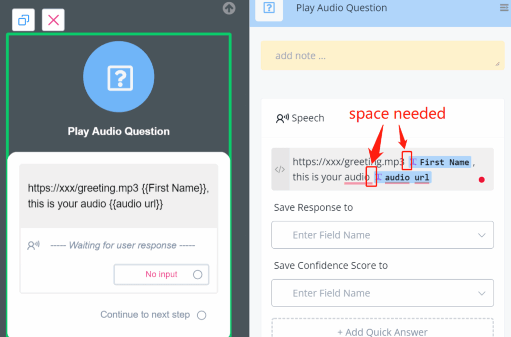 You can put the link directly in the text box or store the link in a text variable. You can also combine audio URL with text when you use it. But remember that don’t let the URL and text connect to each other, because the system cannot recognize it as an audio URL link. See screenshot below.