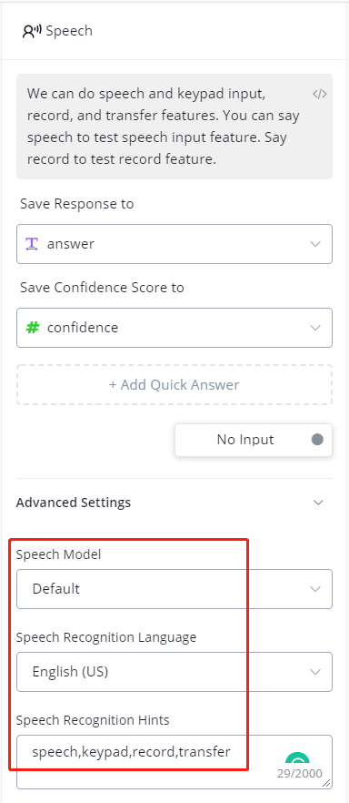 Select correspond speech model and language. “Numbers and Commands” speech mode can help improve the recognition rate when the answer is a string of numbers, etc. Please note that, Twilio charges for using this mode. More importantly, provide the bot with some hints, keywords that might appear in speech (separated by commas and no space).