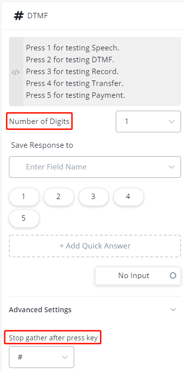 “Stop Key” is set to “#” by default, but it is also editable. You will need “Stop Key” when you don’t know how many digits to expect. Don’t forget to mention the “Stop Key” in the question box. 🤖🤖