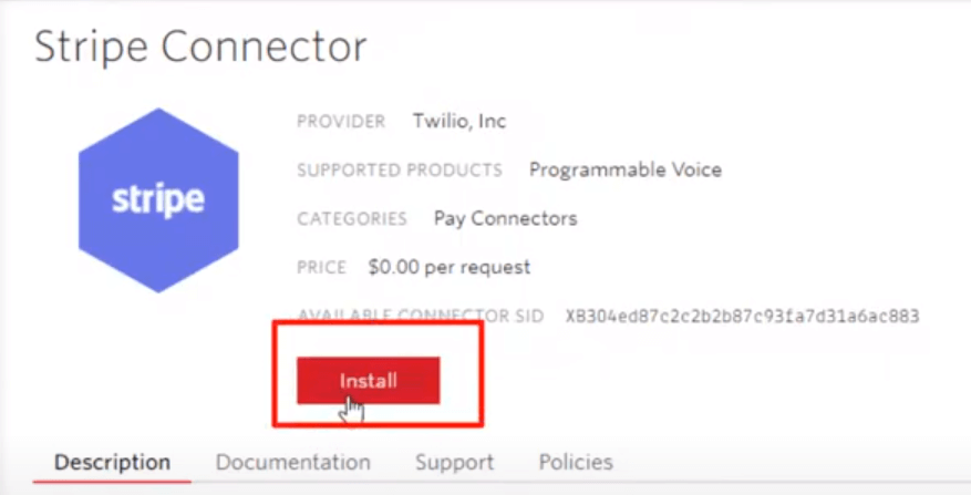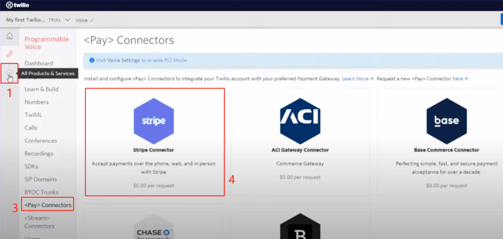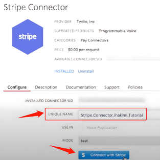 To get a “Payment Connector”, which is “Unique connector ID”, you will need to access your phone number provider and payment service provider. Twilio and Stripe, for example, go twilio.com, follow step 1 to 4 in the following 2 pictures: