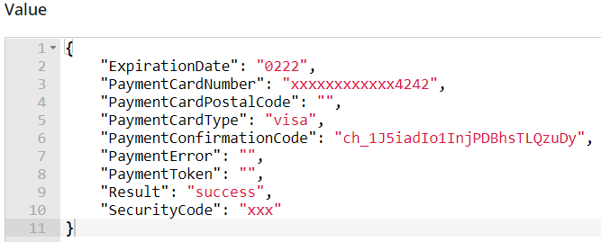 You will need a JSON variable to hold the payment result. This is a response example including some card details, confirmation code and payment result.