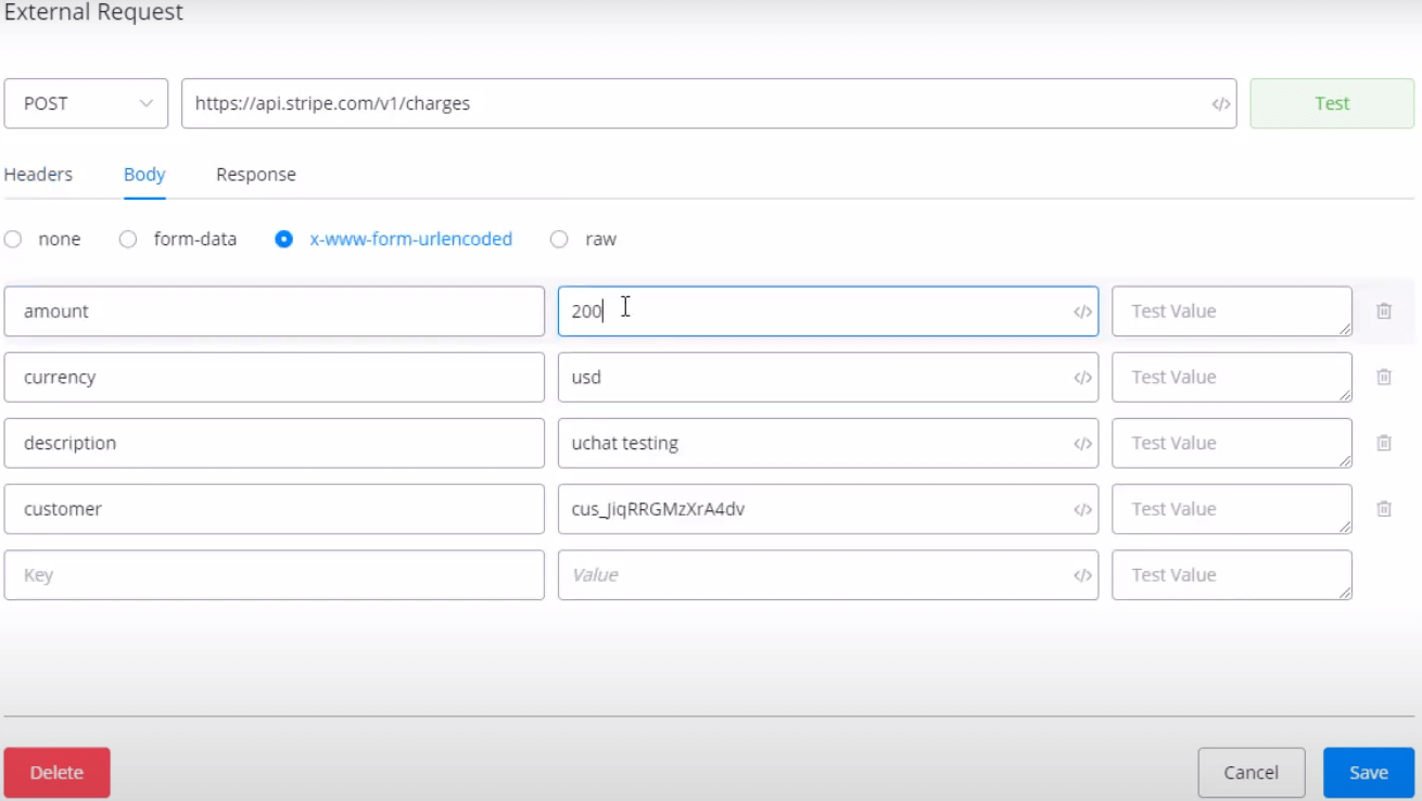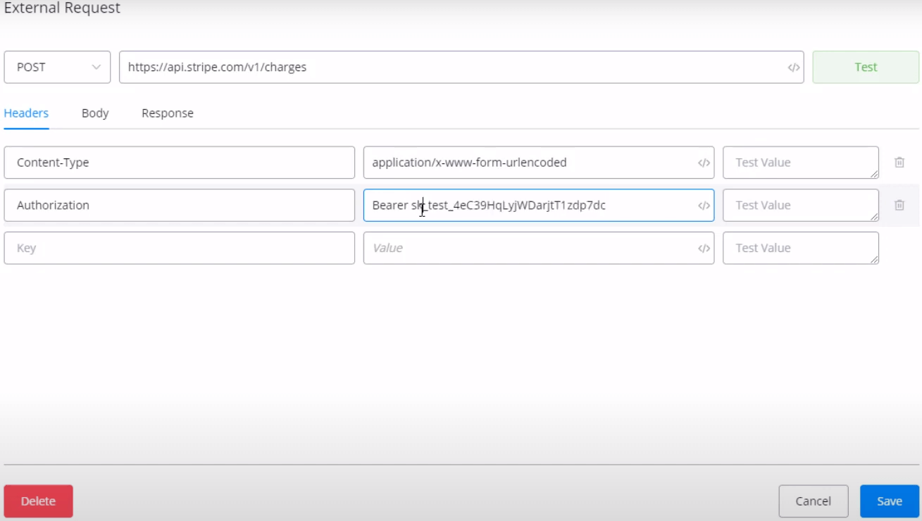 In the example, a post request is sent to Stripe with a testing API key and a charge amount, currency and the reusable token, i.e. the customer ID.