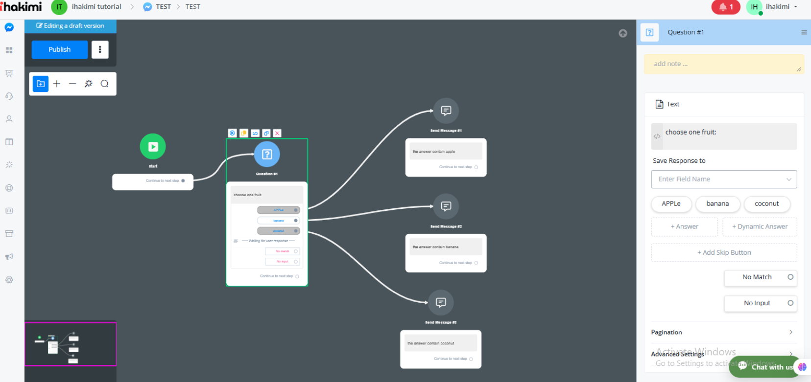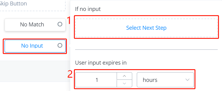 Similarly, “No Input” helps you redirect the flow when user input expires. By default, a question expires in 1 hour. Make it shorter if needed.