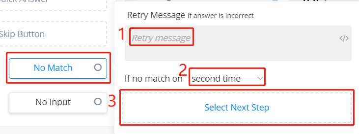 “No Match” is a very practical feature because different answer types have different specified patterns. Email address, for example, has to be “[email protected]”. You can put something like “Wrong email, please try again” as your retry message and jump to another step if no match on several times.