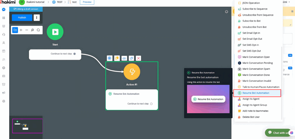 You can resume automation at any point in your flow using the action node. Here’s how: